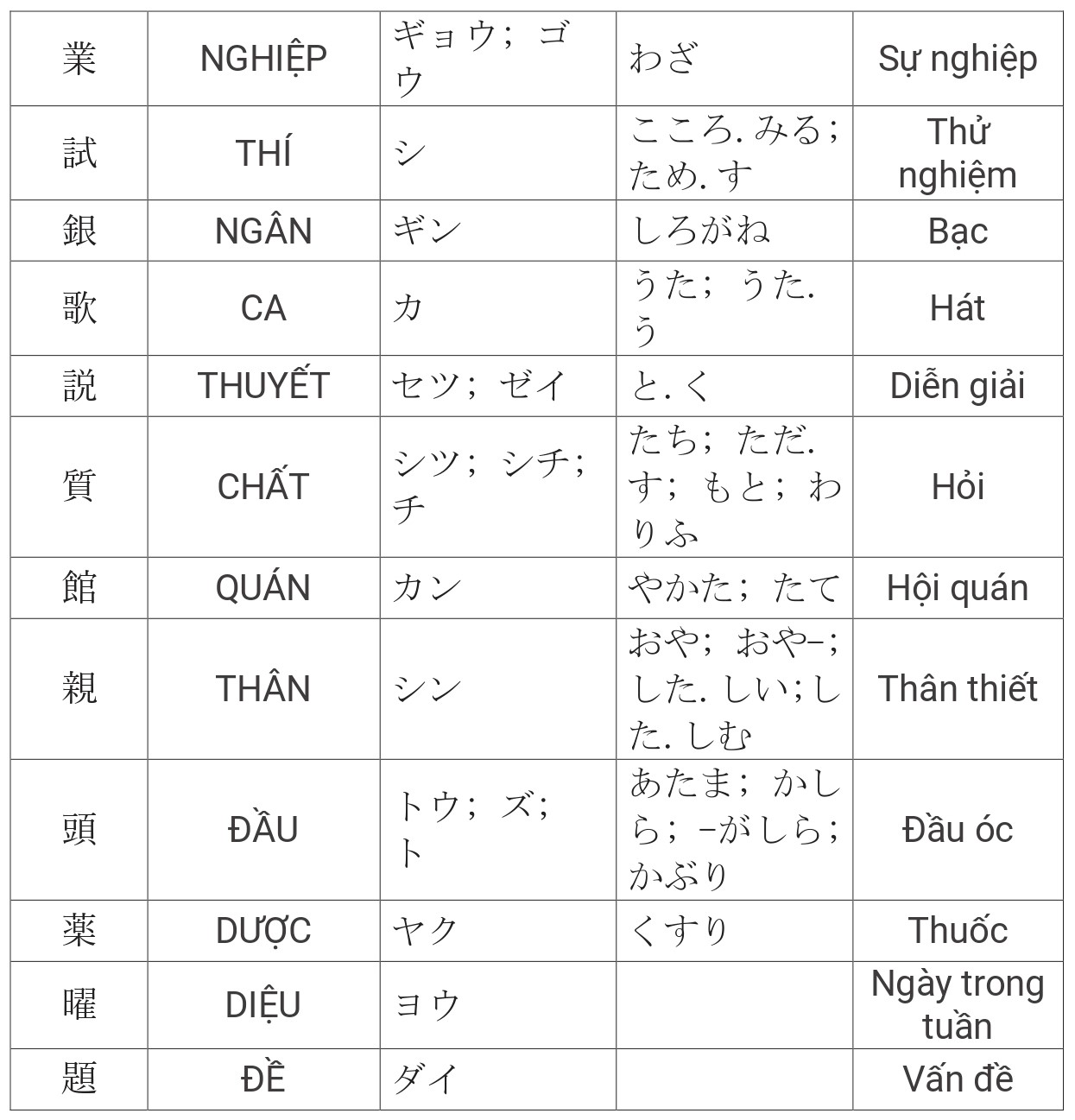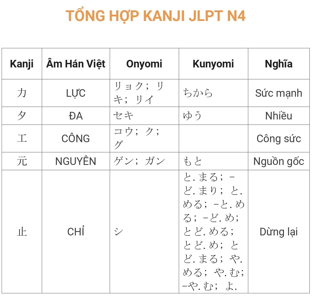 Tổng hợp Kanji JLPT N4 Kanji N4 Tổng hợp Kanji JLPT N4 Xem thêm: Tổng hợp 180 chữ Kanji N4 100 Từ Kanji N4 và Từ vựng liên quan 2025-11-01 Lê Nguyễn Share